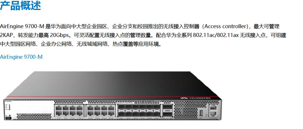 AirEngine 9700-M是華為面向中大型企業(yè)園區(qū)、企業(yè)分支和校園推出的無線接入控制器(Access controller),最大可管理2K AP,轉(zhuǎn)發(fā)能力最高20Gbps。配合華為全系列802.11ac/802.11ax無線接入點(diǎn),可組建中大型園區(qū)網(wǎng)絡(luò)、企業(yè)辦公網(wǎng)絡(luò)、無線城域網(wǎng)絡(luò)、熱點(diǎn)覆蓋等應(yīng)用環(huán)境。